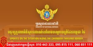 (ភ្នំពេញ)៖ ក្រសួងការពារជាតិ បានឲ្យដឹងថា សភាពការណ៍ជួរមុខក្នុងភូមិសាស្រ្តយោធភូមិភាគទី៤ និងយោធភូមិភាគទី៥ បន្ទាប់ពីកម្ពុជា និងថៃបានឯកភាពគ្នាលើបទឈប់បាញ់ជាបន្ទាន់ និងបានចុះហត្ថលេខាលើសេចក្តីប្រកាសរួម និងចូលជាធរមាននៅវេលាម៉ោង ១២:០០ថ្ងៃត្រង់ (ម៉ោងក្នុងស្រុក) នៅថ្ងៃទី២៧ ខែធ្នូ ឆ្នាំ២០២៥ គិតមកដល់វេលាម៉ោង១២៖០០ថ្ងៃត្រង់ ថ្ងៃទី២៩ ខែធ្នូ ឆ្នាំ២០២៥ ស្ថានការណ៍នៅជួរមុខមានសភាពស្ងប់ស្ងាត់។