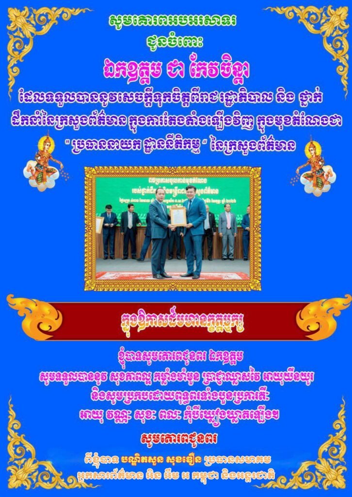 សូមគោរពអបអរសាទរ! ចំពោះ ឯកឧត្តម ជា កែវចិន្តា ដែលទទួលបាននូវសេចក្តីទុកចិត្តពីរាជរដ្ឋភិបាល និងថ្នាក់ដឹកនាំនៃក្រសួងព័ត៌មាន ក្នុងការតែងតាំងឡេីងវិញ! ក្នុងមុខតំណែងជា «ប្រធាននាយកដ្ឋាននីតិកម្ម» នៃក្រសួងព័ត៌មាន ដដែល !!!