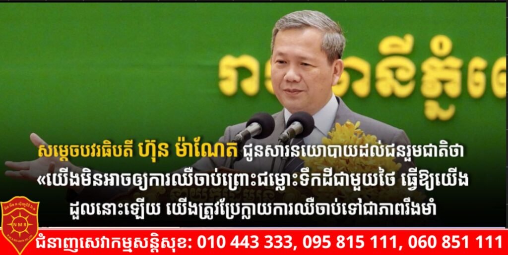 សម្តេចបវរធិបតិ ហ៊ុន ម៉ាណែត បានបញ្ជាក់ថា ជំហររបស់រាជរដ្ឋាភិបាល គឺការខិតខំដោះស្រាយបញ្ហាដោយសន្តិវិធី ដោយឈរលើមូលដ្ឋានច្បាប់អន្តរជាតិ នៅលើបញ្ហាព្រំដែន គឺជាគោលការណ៍ដែលរាជរដ្ឋាភិបាល បានខិតខំដាក់ទិសដៅ ពីព្រោះមានតែវិធីសាស្ត្រដោះស្រាយបញ្ហាលើគោលការណ៍តែប៉ុណ្ណោះ ទើបអាចធានាបាននូវប្រសិទ្ធភាពដែលអាយូរអង្វែង។ លទ្ធផលអាចយឺត អាចលំបាកខ្លះ ប៉ុន្តែ យើងត្រូវប្រឈមដោះស្រាយទាំងអស់គ្នាហើយរកវិធីមួយ ដើម្បីដោះស្រាយបញ្ចប់ និងមិនឱ្យវាកើតឡើងវិញនៅថ្ងៃអនាគត ដើម្បីធានានូវភាពសុខក្សាន្តរបស់យើង កន្លែងដែលពីមុនជាសមរភូមិប្រយុទ្ធ ក្រោយមកប្រែក្លាយជាការអភិវឌ្ឍ ភ្ជាប់ទំនាក់ទំនងជាមួយប្រទេសជិតខាង ប៉ុន្តែ ជាអកុសល ក្នុងរយៈពេលខ្លីនេះ វាបានក្លាយទៅជាដែនសមរភូមិឡើងវិញ យើងសង្គមថា វានឹងបញ្ចប់ ប្រែក្លាយអភិវឌ្ឍន៍ រស់រវើកឡើងវិញ។