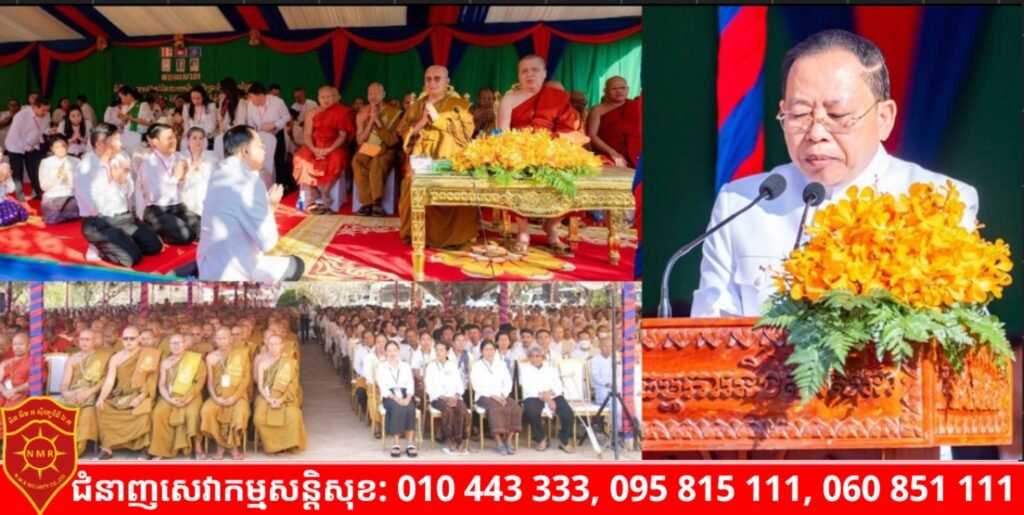 លោកបណ្ឌិតរដ្ឋមន្ត្រី បានពាំនាំនូវប្រសាសន៍ផ្តាំផ្ញើសួរសុខទុក្ខ ពីសំណាក់ សម្តេចតេជោ ហ៊ុន សែន ប្រធានព្រឹទ្ធសភា សម្តេចកិត្តិព្រឹទ្ធបណ្ឌិត ប៊ុន រ៉ានី ហ៊ុនសែន សម្តេចមហាបវរធិបតី ហ៊ុន ម៉ាណែត នាយករដ្ឋមន្ត្រី និងលោកជំទាវបណ្ឌិត ពេជ ចន្ទមុន្នី ហ៊ុនម៉ាណែត ថ្វាយ ប្រគេន និងជូនដល់សម្តេចជាអម្ចាស់ ព្រះរាជគណៈ ព្រះថេរានុត្ថេរៈគ្រប់ព្រះអង្គ លោក លោកស្រី លោកអ្នកឧកញ៉ា អ្នកឧកញ៉ា ឧកញ៉ា លោក លោកស្រី មន្ត្រីរាជការ កងកម្លាំងប្រដាប់អាវុធ លោកតា លោកយាយ លោកគ្រូ អ្នកគ្រូ សិស្សានុសិស្ស ព្រមទាំងពុទ្ធបរិស័ទទាំងអស់ ដែលបាន យាង និមន្ត និងអញ្ជើញចូលរួមនៅក្នុងពិធីនាថ្ងៃនេះ។