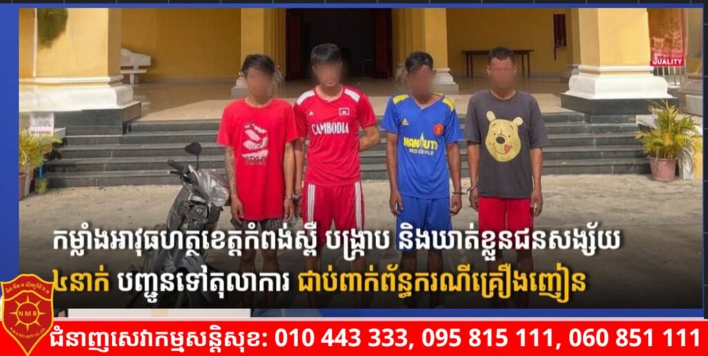 កម្លាំងអាវុធហត្ថខេត្តកំពង់ស្ពឺ បង្រ្កាប និងឃាត់ខ្លួនជនសង្ស័យ៤នាក់ បញ្ជូនទៅតុលាការ ជាប់ពាក់ព័ន្ធករណីគ្រឿងញៀន