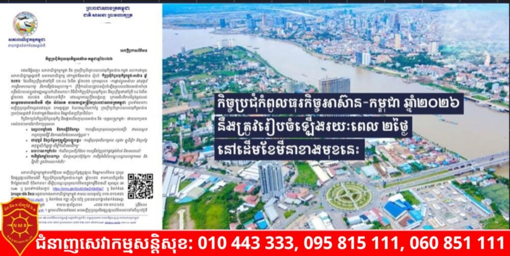 (ភ្នំពេញ)៖ សភាពាណិជ្ជកម្មកម្ពុជា និងក្រុមប្រឹក្សាពិគ្រោះយោបល់ធុរកិច្ចអាស៊ាន-កម្ពុជា សហការជាមួយសភាពាណិជ្ជកម្មអន្តរជាតិ សមាគមពាណិជ្ជកម្មនៅកម្ពុជា និងអាស៊ាន រៀបចំ «កិច្ចប្រជុំកំពូលធុរកិច្ចកម្ពុជា-អាស៊ាន ឆ្នាំ២០២៦» ដែលនឹងប្រព្រឹត្តទៅនៅថ្ងៃទី ០៣-០៤ ខែមីនា ឆ្នាំ២០២៦ ក្រោមមូលបទ «ការផ្លាស់ប្តូរអាស៊ាន៖ នវានុវត្តន៍ ការធ្វើសមាហរណកម្ម និងការវិវត្តនៃឧស្សាហកម្ម»។