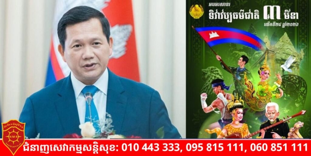 (ភ្នំពេញ)៖ សម្តេចបវរធិបតី ហ៊ុន ម៉ាណែត នាយករដ្ឋមន្ត្រីនៃកម្ពុជា បានចេញសារាចរណែនាំ ស្តីពីការរៀបចំទិវាវប្បធម៌ជាតិ ៣មីនា លើកទី២៨ ឆ្នាំ២០២៦។