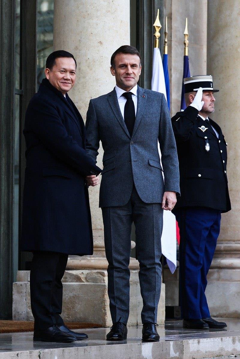 (ប៉ារីស, បារាំង)៖ សម្តេចមហាបវរធិបតី ហ៊ុន ម៉ាណែត នាយករដ្ឋមន្ត្រីកម្ពុជា បានចាប់ផ្តើមដំណើរ​ទស្សនកិច្ច​ជាផ្លូវការរបស់សម្តេចនៅក្នុងប្រទេសបារាំងហើយ។ ជាមួយការចាប់ផ្តើមដំណើរទស្សនកិច្ចផ្លូវ​ការនេះនៅរសៀលថ្ងៃព្រហស្បតិ៍ ទី១៨ ខែមករា ឆ្នាំ២០២៤នេះ សម្តេចធិបតី ហ៊ុន ម៉ាណែត ទទួលបាន​ការ​ស្វាគមន៍យ៉ាងកក់ក្តៅបំផុតលោក អេម៉ានូអែល ម៉ាក្រុង ប្រធានាធិបតីបារាំង។