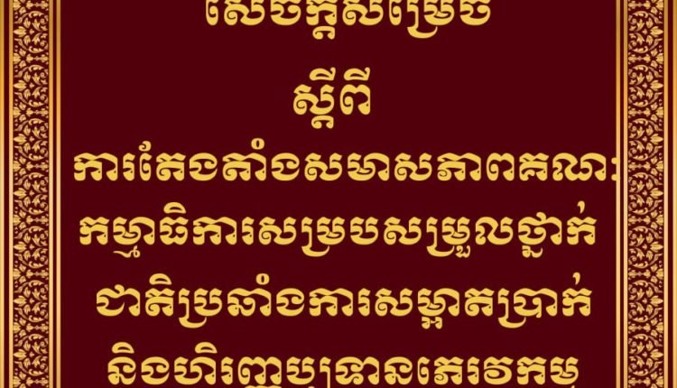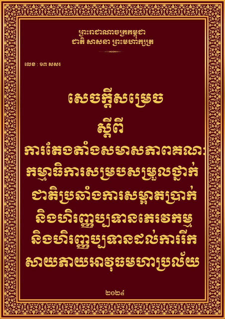 សេចក្តីសម្រេច លេខ១៣សសរ ស្តីពីការតែងតាំងសមាស ភាព គណៈកម្មាធិការ សម្របសម្រួលថ្នាក់ជាតិប្រឆាំង ការសម្អាត ប្រាក់និងហិរញ្ញប្បទានភេរវកម្ម និងហិរញ្ញប្បទានដល់ការរីក សាយភាយអាវុធមហាប្រល័យ ព័ត៌មានជាតិ ចេញផ្សាយ 18/01/2024 22:58 pm