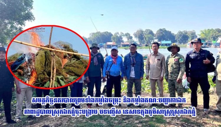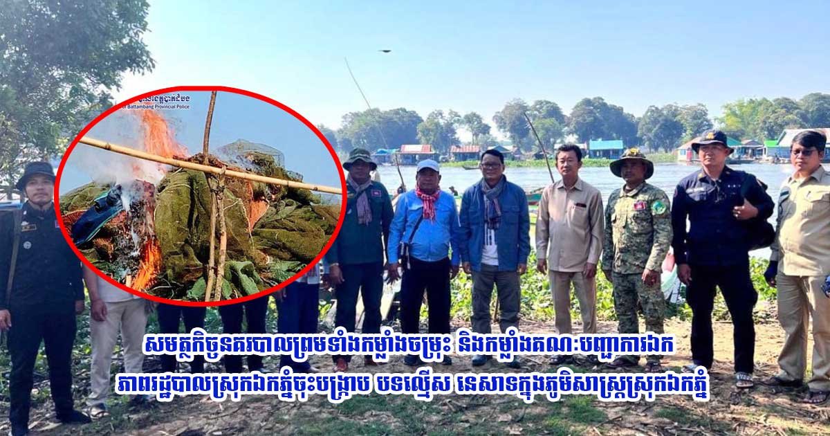 បាត់ដំបង៖ កាលពីថ្ងៃទី១៩ខែ មករា ឆ្នាំ២០២៤ អនុវត្តតាមយបល់ដឹកនាំរបស់លោ ក ឧត្តមសេនីយ៍ទោ សាត គឹមសាន ស្នងការ នៃស្នងការដ្ឋាននគរបាលខេត្តបាត់ដំបង និងលោកវរសេនីយ៍ឯក ភួង ច័ន្ទតារ៉ា ស្នងការរងផែនការ ងារនគរបាលប្រឆាំងបទល្មើ ស សេដ្ឋកិច្ចនិងលោកវរសេនីយ៍ឯក អ៉ិម កុសល ស្នងការរងទទួលដឹកនាំការិយាល័យនគរបាលប្រឆាំ ងបទ ល្មើសសេដ្ឋកិច្ចលោកវរសេ នីយ៍ឯក យី យក់សាននាយការិយាល័យនគរបាលប្រឆាំងបទល្មើសសេដ្ឋកិច្ចបានដឹកនាំកម្លាំងក្នុងការិយាល័យ សហការជាមួយកម្លាំងក្រុមអន្តរាគមន៍បង្ការបង្ក្រាបនៃស្នងការដ្ឋាន កម្លាំងកងរាជអាវុធហត្ថខេត្ត កម្លាំងយោធភូមិភាគ៥កម្លាំងសឹករងខេត្តកម្លាំងស៊ើបការមណ្ឌល៥ សមត្ថកិច្ចបរិស្ថាន សមត្ថកិច្ចជលផលនិងកម្លាំងគណៈ បញ្ជាការឯកភាពរដ្ឋបាលស្រុកឯក ភ្នំដឹកនាំដោយលោក ម៉ិល សុផល អភិបាលស្រុកឯកភ្នំ មន្ត្រីអធិការកិច្ច ដែលក្នុងនោះមានលោក ថេង សំណាង ព្រះរាជអាជ្ញារង នៃអយ្យការអមសាលាដំបូងខេត្តបាត់ដំបង តំណាងឯកឧត្តម កែវ សុជាតិ ព្រះរាជអាជ្ញានៃអយ្យការអមសាលាដំបូងខេត្តបាត់ដំបងបានចុះបង្ក្រាបបទល្មើសនេសាទខុសច្បាប់នៅក្នុងភូមិសាស្ត្រកប់ឆេះ(អតីតឡូត៍នេសាទលេខ២) ក្នុងតំបន់រ៉ាមសារព្រែកទាល់ ឃុំកោះជីវាំង ស្រុកឯកភ្នំ ខេត្តបាត់ដំបង ទទួលបានលទ្ធផលដូចខាងក្រោម៖