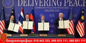 ភ្នំពេញ)៖ ទីបំផុត ! កិច្ចព្រមព្រៀងសន្តិភាពកម្ពុជា-ថៃ ត្រូវបានចុះហត្ថលេខាដោយជោគជ័យហើយ នាព្រឹកថ្ងៃទី២៦ ខែតុលា ឆ្នាំ២០២៥នេះ ដោយ សម្តេចមហាបវរធិបតី ហ៊ុន ម៉ាណែត នាយករដ្ឋមន្រ្តីនៃកម្ពុជា និង លោក អនុទីន ចាន់វីរៈកុល នាយករដ្ឋមន្រ្តីថៃ ក្រោមអធិបតីភាព លោក ដូណាល់ ត្រាំ ប្រធានាធិបតីអាមេរិក ហើយដោយមានការចូលរួមពី នាយករដ្ឋមន្រ្តីម៉ាឡេស៊ី ដែលជាប្រធានអាស៊ាន នៅអំឡុងកិច្ចប្រជុំកំពូលអាស៊ាន ដែលម៉ាឡេស៊ីធ្វើជាម្ចាស់ផ្ទះ។