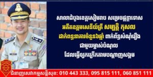 សៀមរាប)៖ សាលាដំបូងខេត្តសៀមរាប កាលពីព្រឹកថ្ងៃទី២៨ ខែតុលា ឆ្នាំ២០២៥ បានប្រកាសសាលក្រមផ្ដន្ទាទោសអតីតឧត្ដមសេនីយ៍ត្រី សម្បត្តិ កុសល ដាក់ពន្ធនាគារចំនួន៦ឆ្នាំ ពាក់ព័ន្ធបទល្មើស ប៉ុនប៉ងសូកប៉ាន់ បទប្ដឹងបរិហារកេរ្កិ៍ភូតកុហក និងបទសូកប៉ាន់ ហើយត្រូវសងសំណងជំងឺចិត្តដល់ជនរងគ្រោះចំនួន២០លានរៀលទៀតផង។